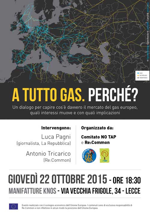 Giovedì 22 ottobre alle Manifatture di Knos a Lecce (Via Vecchia Frigole, 34) si svolgerà un evento organizzato da Re:Common e Comitato NO TAP durante il quale Luca Pagni (giornalista, La Repubblica) e Antonio Tricarico (Re:Common) proveranno a spiegare che cos’è davvero il mercato del gas europeo, quali interessi muove e con quali implicazioni. L’inizio dell’incontro è previsto per le ore 18.30.