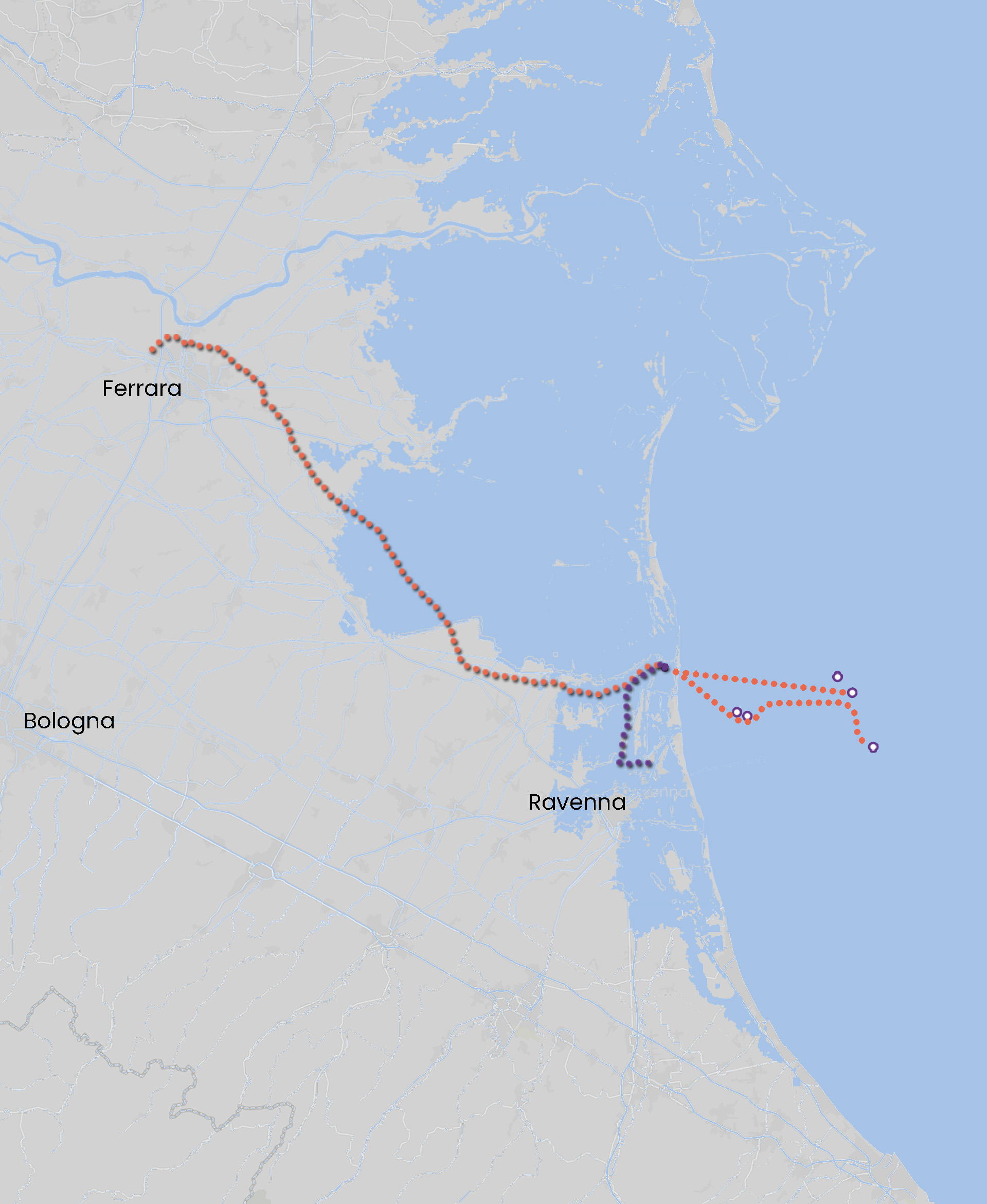 Fonte dei dati per l’elaborazione delle mappe: documentazione pubblica depositata da SNAM sul sito del ministero dell’Ambiente e della sicurezza energetica nel procedimento di Valutazione di Impatto Ambientale del progetto CCS Pianura Padana – Rete di Trasporto CO2, Gasdotti Ferrara-Casalborsetti e Ravenna-Casalborsetti.