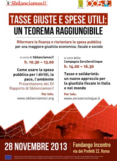 Il 28 novembre Re:Common, la Campagna Sbilanciamoci! e la campagna zerozerocinque promuovono una giornata di dibattiti e proposte su come riformare la finanza e riorientare la spesa pubblica per una maggiore giustizia economica, fiscale e sociale, nell’ambito del Tax and solidarity day europeo.
