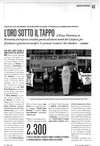 A Rosia Montana, in Romania, un’impresa canadese punta ad alcuni monti dei Carpazi, per sfruttarne i giacimenti auriferi. Dopo un “salvataggio” da 20 miliardi di euro sono infatti arrivati i privati. Per questo sono iniziate le “creative” proteste dei cittadini.