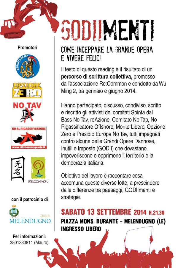 GODIIMENTI – Come inceppare la Grande Opera e vivere felici. Il 13 settembre il reading di Wu Ming 2 a Melendugno
