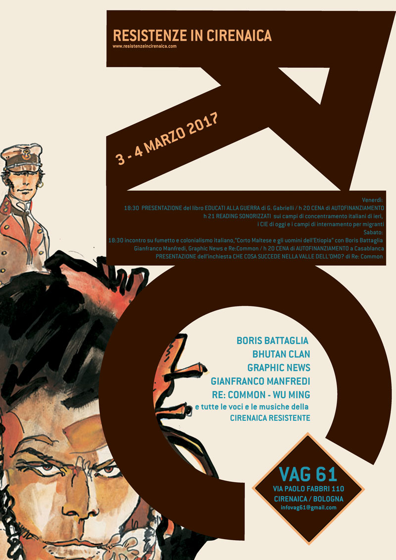 h18.30: incontro “Fumetto e colonialismo italiano: dal Ventennio a oggi passando per Hugo Pratt” con Boris Battaglia, Gianfranco Manfredi, l’associazione Re:Common e altri. Durante l’incontro sarà presentata la graphic novel di Re:Common, “L’Alleato azero”.
