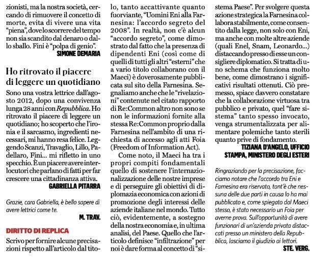 Quello che l’articolo definisce ”infiltrazione” per noi è dare forma al concetto di “Sistema Paese”. Per svolgere questa azione strategica la Farnesina – lo confermiamo – collabora stabilmente, come consentito dalla legge, non solo con ENI, ma anche con molte altre aziende (quali ENEL, SNAM, LEONARDO..) distaccando presso di esse un consigliere diplomatico. Si tratta di uno schema che funziona molto bene, come dimostrano i significativi risultati ottenuti.